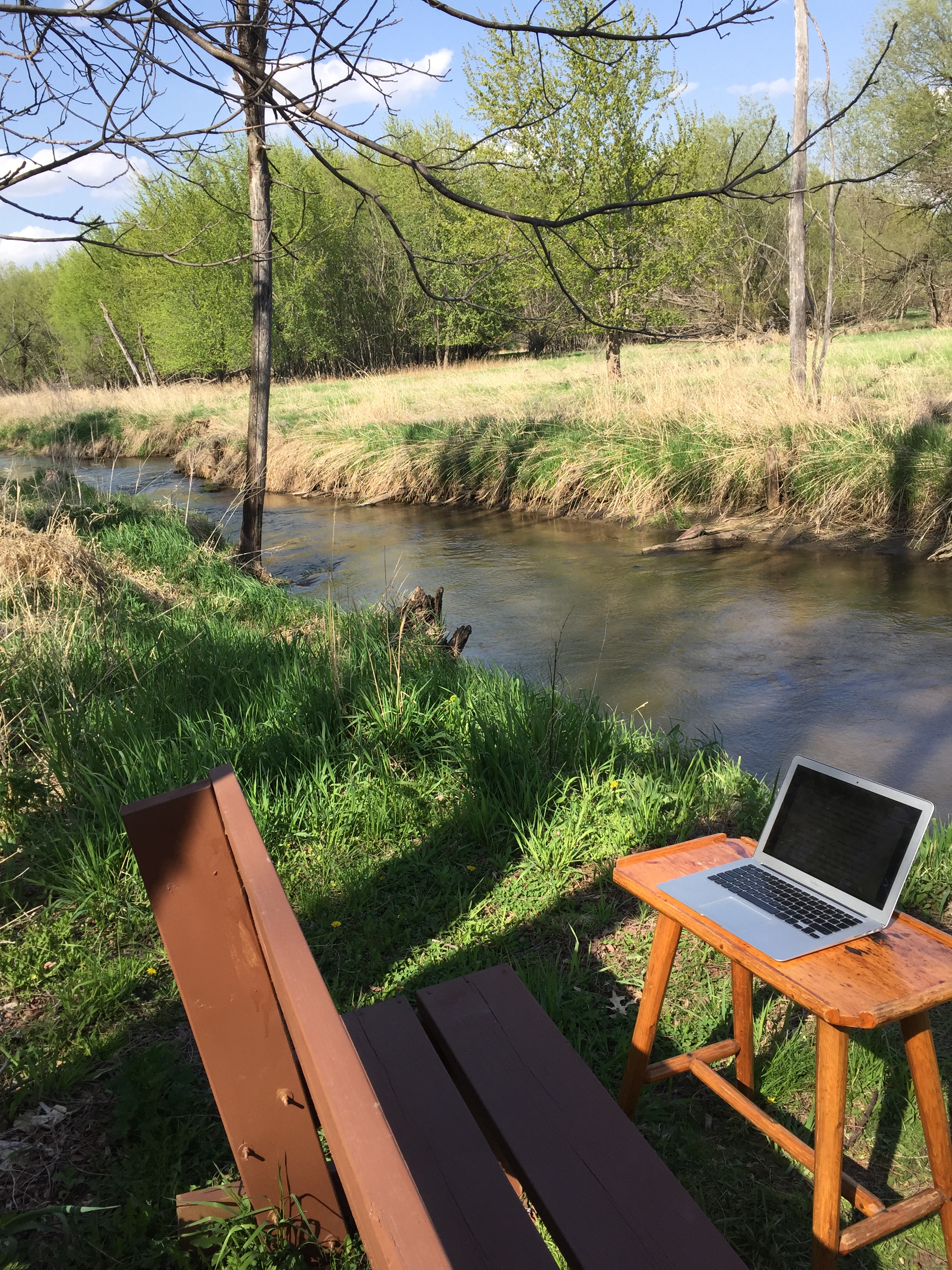 The water sounded different as it whispered around the rushes and the fallen branch. I sat and I got a new perspective on my little stream…and started notes for my next book.